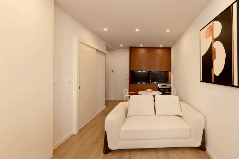Com a sua dimensão acolhedora, este apartamento destaca-se pelo seu design inteligente e pela decoração cuidada, onde cada detalhe foi pensado para criar um ambiente moderno, funcional e cheio de charme. A combinação entre elementos contemporâneos e apontamentos de carácter torna este espaço verdadeiramente único.